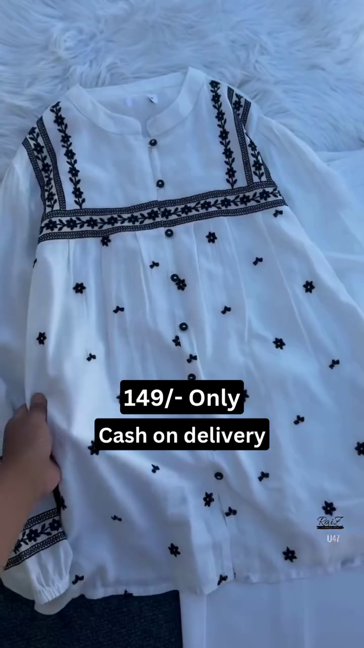 Top Design: Long-sleeve button-down blouse with delicate embroidered detailing.